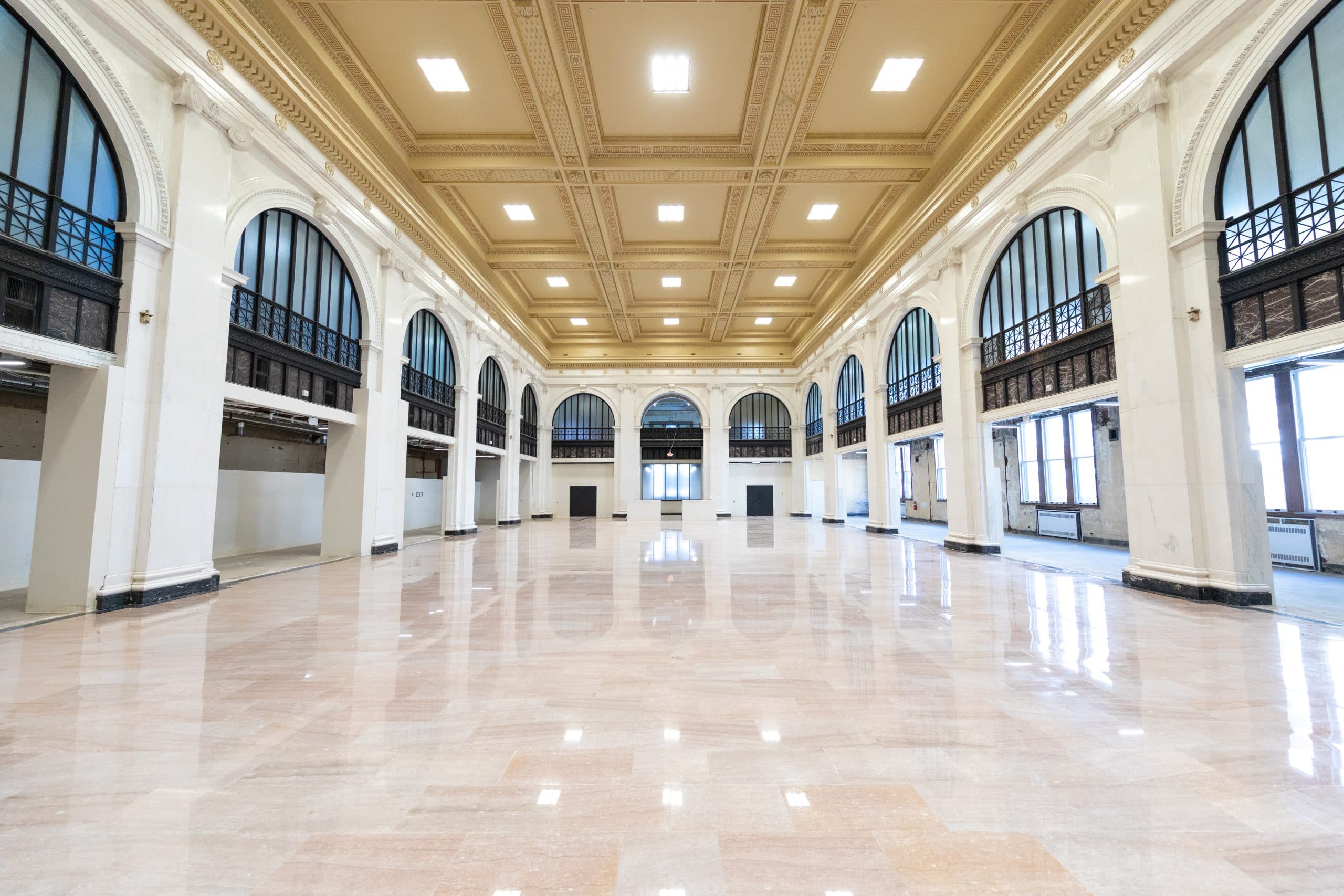 The front section of the space can accommodate up to 130 guests for a seated event and up to 250 guests for a strolling reception. The back section of the space can accommodate up to 500 guests for a seated event and up to 600 guests for a strolling reception.