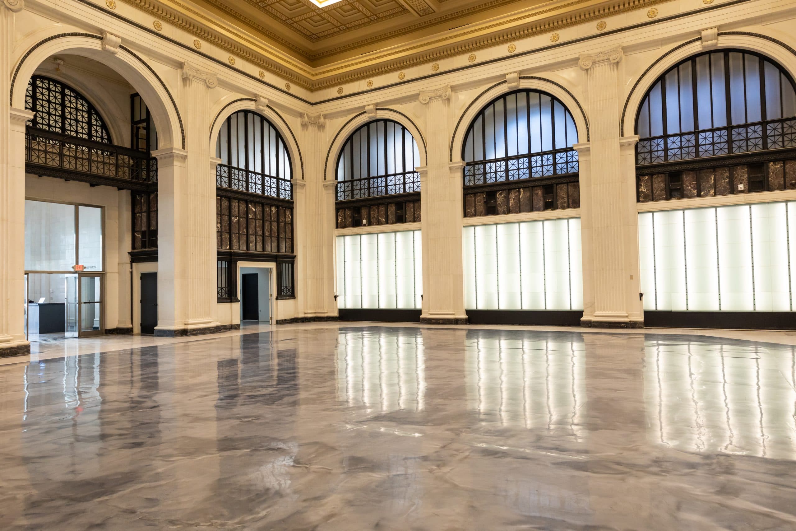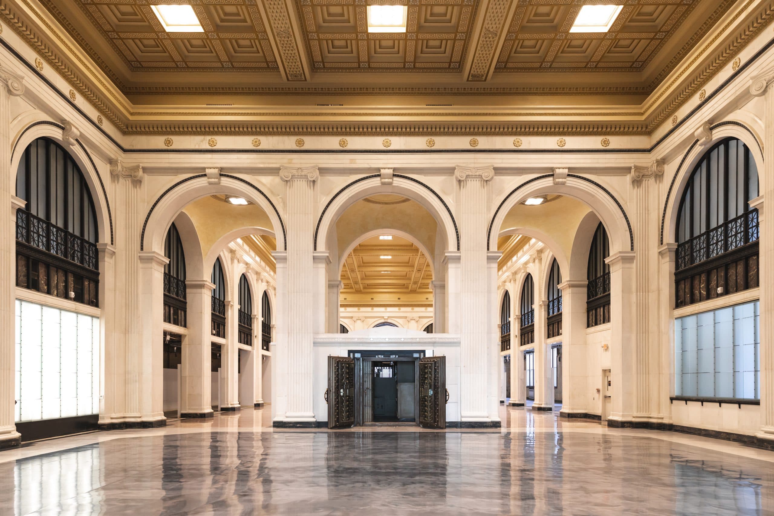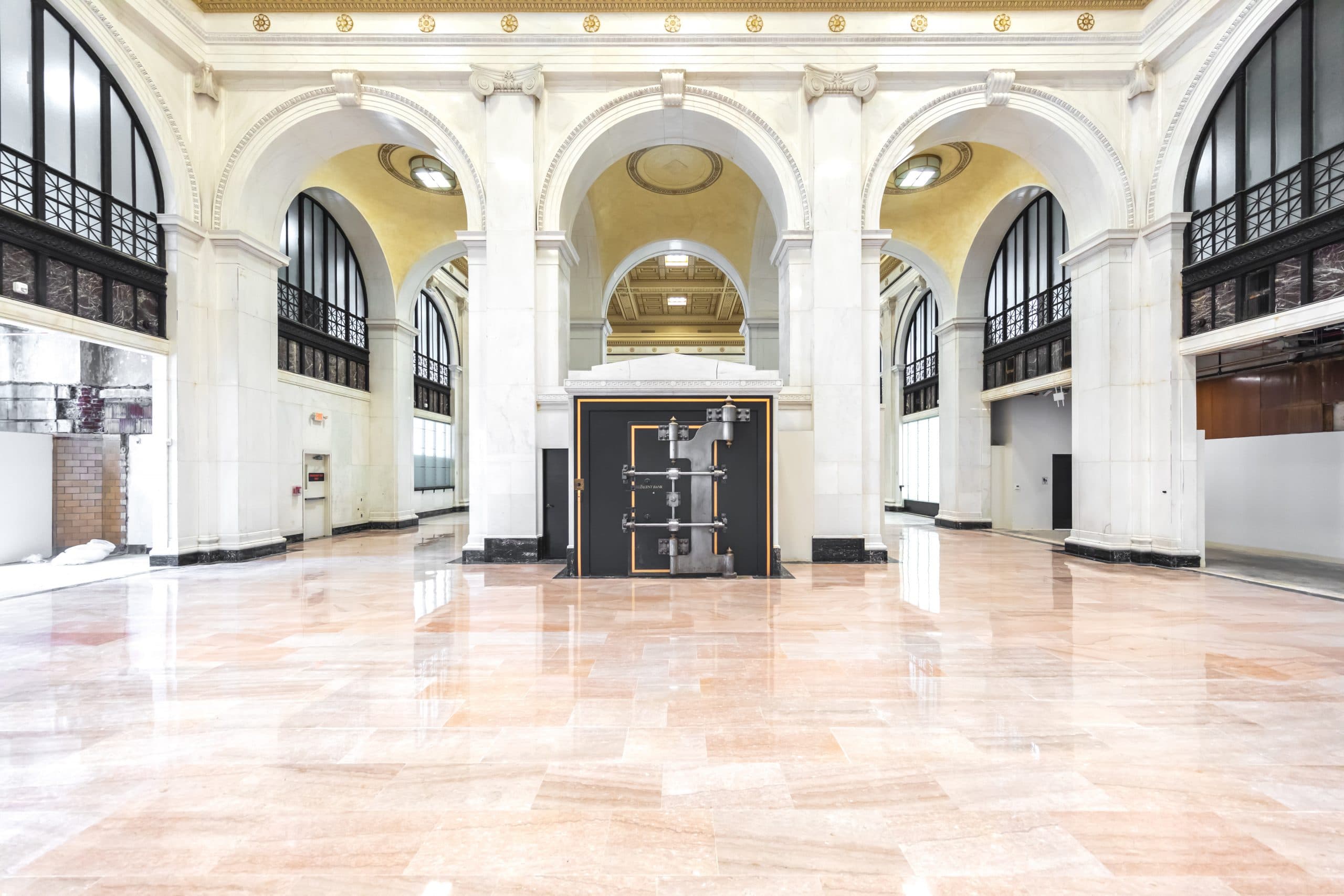 The original bank vault centers the room and the restored gilded ceiling provides a stunning architectural element to any event.