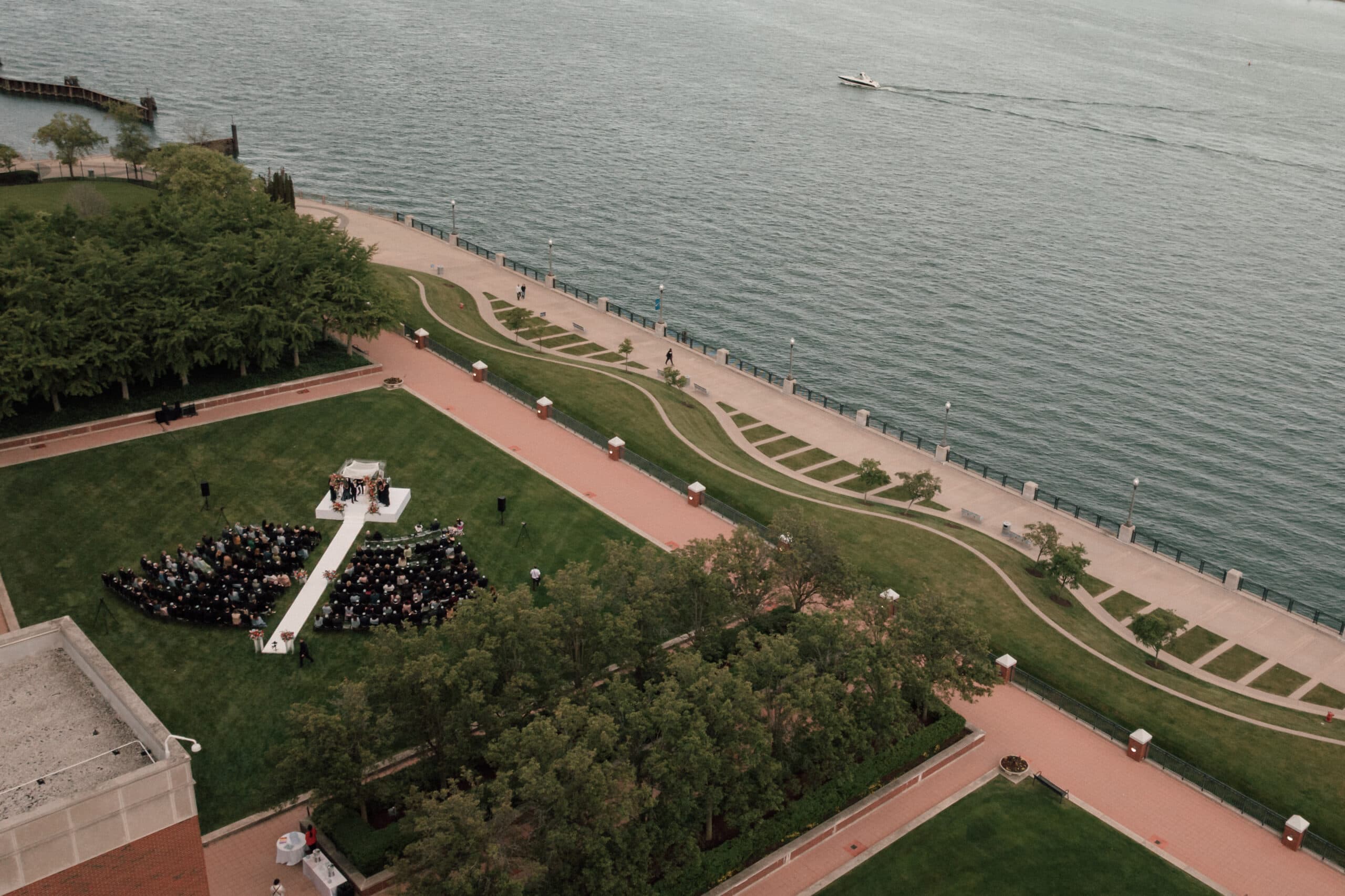 The building’s spacious and airy three-story atrium offers unparalleled views of the Detroit River. This atrium is one of Detroit’s largest and can accommodate more than 1000 people strolling and up to 750 people for a seated event. The floor-to-ceiling windows allow for an abundance of natural light in the space, while the motorized window shades provide flexibility and control. Just outside of the atrium is 800 feet of riverside frontage to host outdoor receptions, ceremonies, and other gatherings with the option to end the evening with a spectacular firework show.